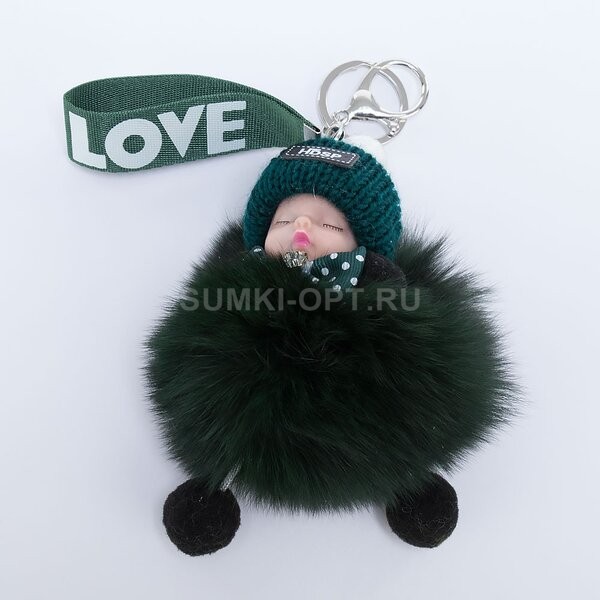 Оригинальный пушистый брелок в виде спящего малыша в шапке. Модель зеленого цвета с текстильной лямкой с надписью “Love”. Имеется цепочка с кольцом и карабином для крепления.