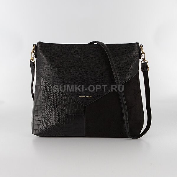 Сумка от торговой марки David Jones из искусственной кожи в черном цвете. Декорирована бархатистой вставкой и с тиснением под крокодиловую кожу. Модель среднего размера со съемной ручкой и съемным регулируемым плечевым ремнем. Внутри: фирменная подкладка, карман на молнии, накладной карман. На задней стороне – карман на молнии.