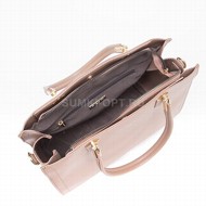 Сумка от торговой марки David Jones из искусственной кожи розового цвета. Модель среднего размера с двумя плотными ручками и съемным регулируемым плечевым ремнем. Три отделения с частичной подкладкой; крайние фиксируются магнитной кнопкой. Среднее отделение на молнии; внутри: карман на молнии, накладной карман. Дно оснащено металлическими ножками для защиты от износа.