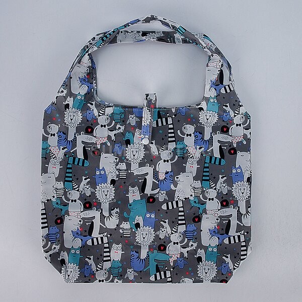 Складная сумка выполнена из лёгкого непромокаемого текстильного материала. Модель серого цвета с забавным изображением животных; закрывается хлястиком на кнопке. Широкие ручки являются продолжением сумки; ее удобно носить как в руках, так и на плече. Вместительная прочная сумка заменит пластиковый пакет. К сумке прилагается чехол с ручками; закрывается на кнопку.