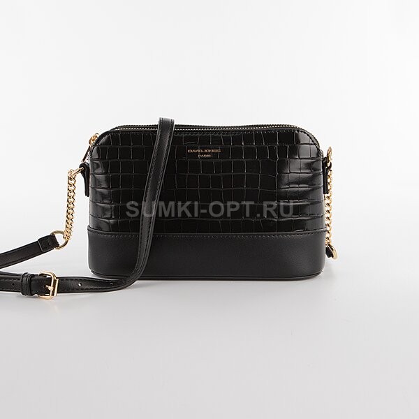 Сумка от торговой марки David Jones из искусственной кожи черного цвета с тиснением под крокодиловую кожу. Модель с несъемным регулируемым плечевым ремнем-цепочкой. Три отделения с фирменной подкладкой. Крайние отделения на молнии; в одном из них – карман на молнии, в другом – накладной карман. Среднее отделение фиксируется магнитной кнопкой.