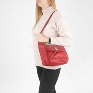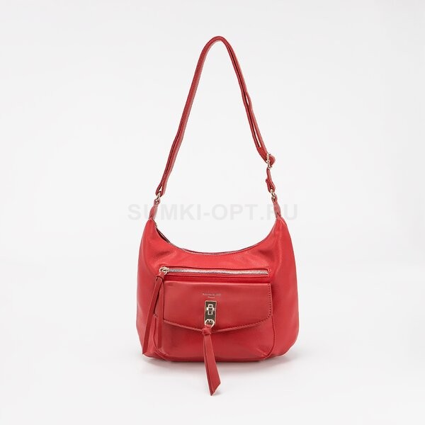 Сумка от торговой марки David Jones из экокожи темно-красного цвета. Модель с несъемной регулируемой ручкой-ремнем. Отделение на молнии. Внутри: фирменная подкладка, карман на молнии и накладной карман. На лицевой стороне – накладной карман с клапаном на поворотном замке, карман на молнии. На задней стороне – карман на молнии. Сумка присборена книзу, дно овальной формы.