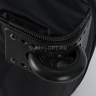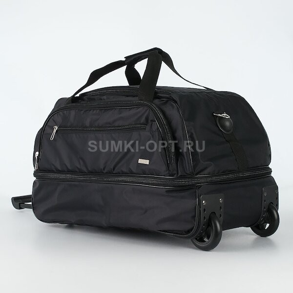 Удобная дорожная сумка на колёсах Mr.Bag выполнена из плотного и практичного полиэстера чёрного цвета. Сумка оснащена двумя колёсами, которые для надёжности утоплены в корпус, выдвижной металлической П-образной ручкой и двумя длинными ручками с фиксирующим ремешком на липучке. Основное вместительное отделение застёгивается на молнию, в комплекте есть плечевой ремень. Снаружи три дополнительных кармана на молниях. Сумка вместительная благодаря молнии для увеличения объёма.